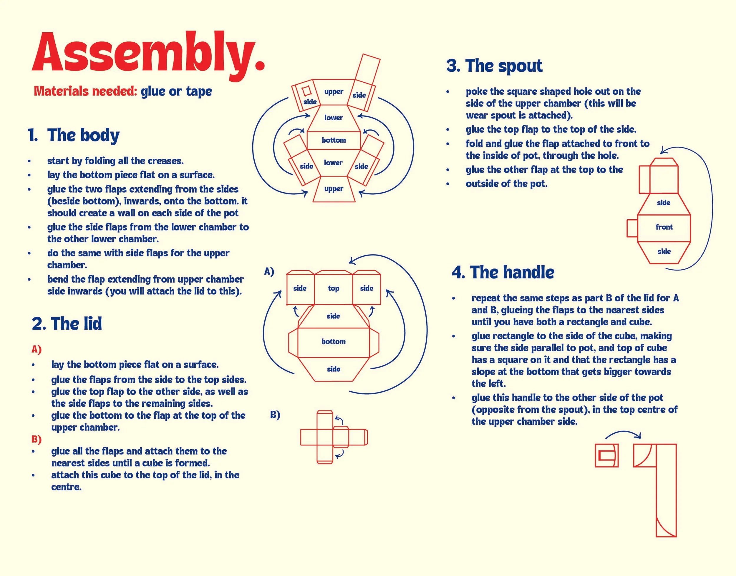 A 3D paper craft kit where I designed and printed die-cut sheets, assembly instructions and an envelope. It's a cartoony and fun way to play barista at home. Unfortunately not suitable for actual liquid coffee, however the spout is hollow and connects to the body—it's designed so you can put coffee beans in it and then pour them out once you've built the pot!